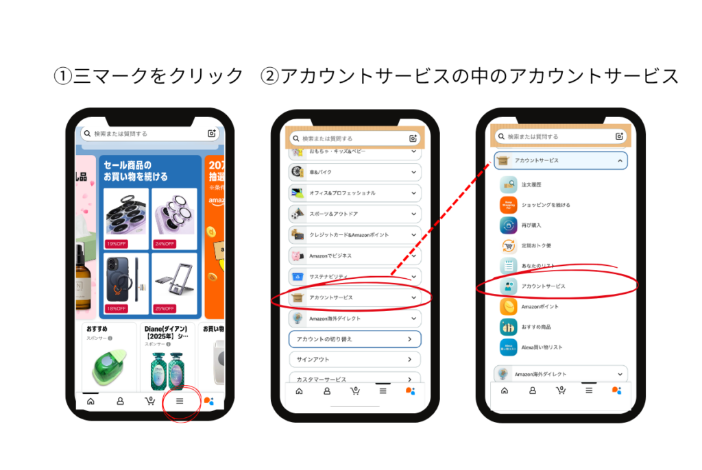 - 下にスクロールして「アカウントサービス」 を見つけクリック